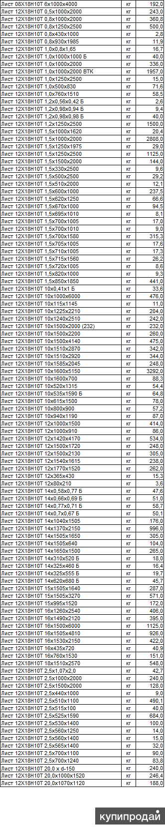283,905 Р | Лист нержавеющий 12Х18Н10Т 0.5 мм, гладкий, пищевой, размеры: 1000×2000 мм, вес 1 метра 3.96 кг, цена за тонну | 283,905 Р | ||