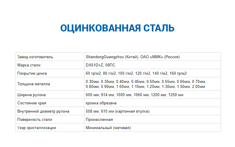 В соответствии со стандартом, исходным материалом для изготовления оцинковки является сталь марки «08пс3сп» (углеродистая, при изготовлении используется прокатка холодным методом). Толщина листа может колебаться от 0,4 до 2,5 мм. Ширина составляет от 71 до 180 см. Длина отдельных листов – от двух до шести метров.