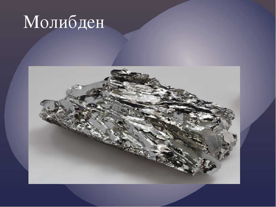 Молибден, как и вольфрам, в периодической системе элементов Д. И. Менделеева расположен в VI группе, но в 5-м периоде. Наиболее характерно для него шестивалентное состояние, хотя известны соединения, в которых молибден имеет другие валентности. Его порядковый номер 42; атомная масса 95,95; плотность при комнатной температуре 10200 кг/м3. Молибден относится к тугоплавким металлам, является переходным элементом. Он плавится при 2620±10°С и кипит примерно при 4800 °С.