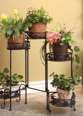 - Удобно размещенная кованая подставка позволяет подходить к цветам для их полива, не испытывая затруднений. При этом растения находятся на нужном расстоянии друг от друга, не затеняя свет.
