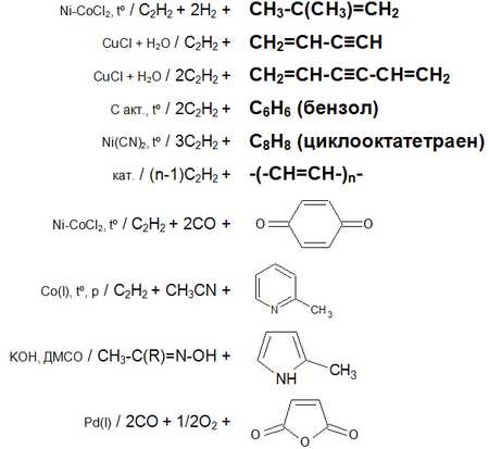Для ацетилена (этина) характерны реакции присоединения, димеризации, полимеризации, цикломеризации.