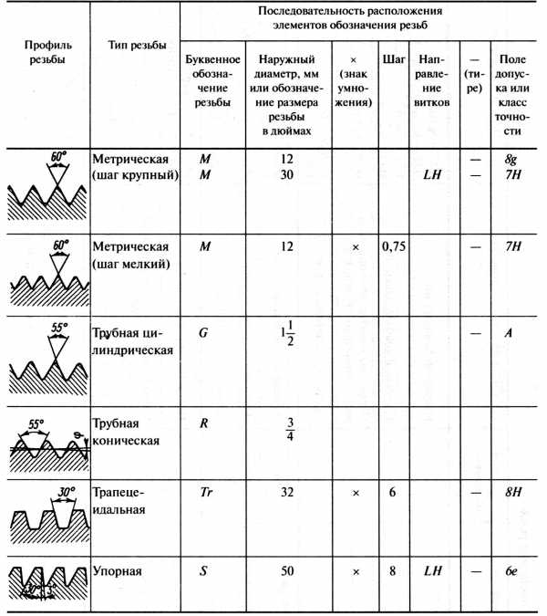 Обозначение различных типов резьбы на чертежах