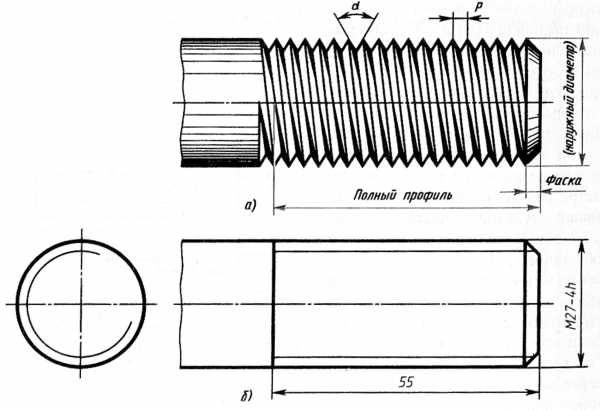 Границу резьбы проводят до линии наружного диаметра резьбы сплошной основной толстой линией.