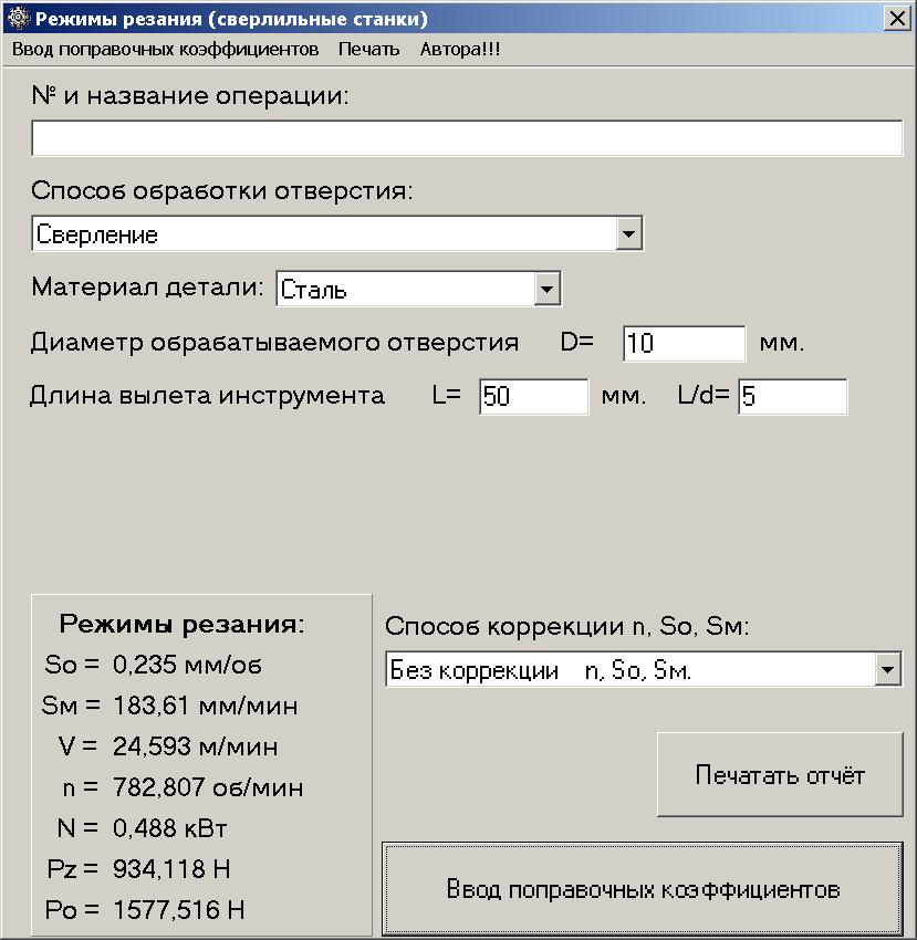 Сила, подача и момент резания рассчитываются по типовым формулам с применением соответствующих коэффициентов.