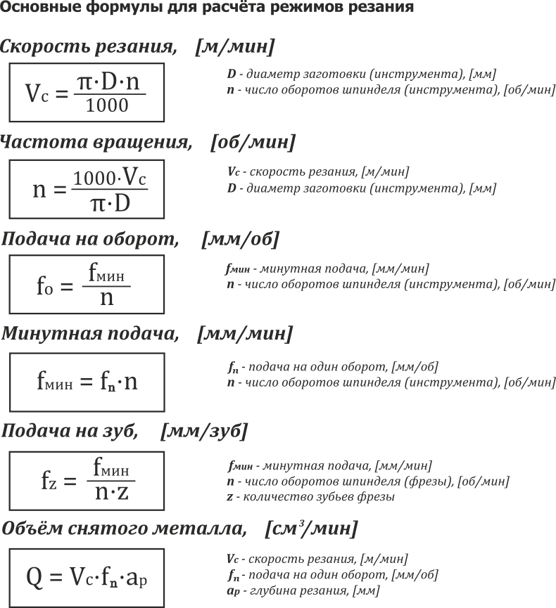 Подробнее о формулах, необходимых для расчета скоростей и подач токарной обработки, сверления и, конечно же, фрезерования