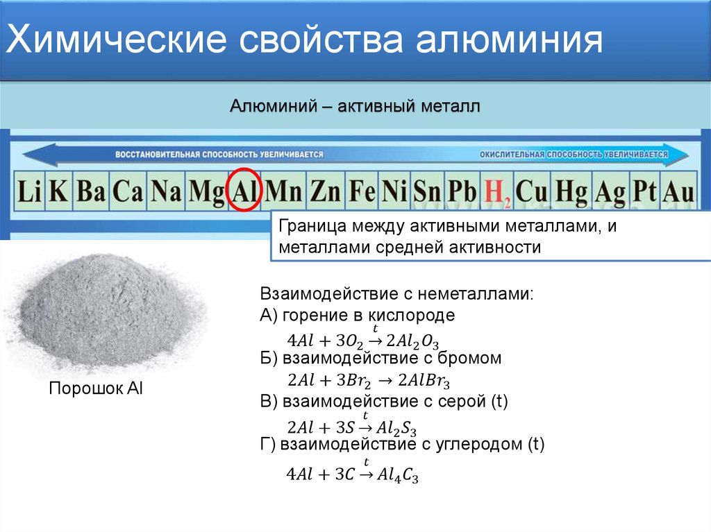 : серебристо-белый податливый легкий элемент, который хорошо проводит электричество и тепло, обладает высокой устойчивостью к окислению и является самым распространенным металлом в земной коре