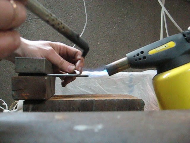 Первоначально надо приготовить припой. Для этого на одну долю меди или бронзы должны приходиться 2 доли серебра. Эти металлы кладутся в тигель, в котором будет осуществляться их нагрев. В качестве нагревателя будет использоваться газовая горелка. Для получения качественного сплава его нужно постоянно перемешивать. Это поможет получить однородную жидкую массу.