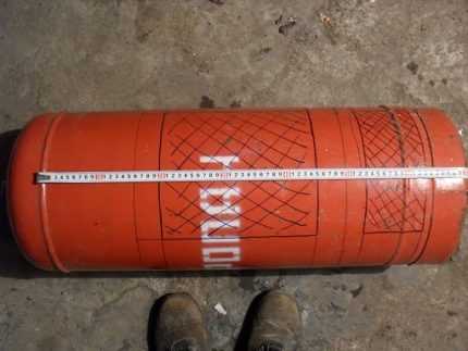 У промышленной (объёмом 40 л) толстые стенки, а диаметр внутренней поверхности слишком маленький для закладки достаточного количества топлива. Оптимальный вариант — пропановая 50-литровая ёмкость высотой 85 см и диаметром 30 см.