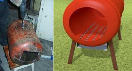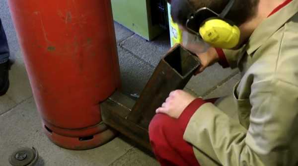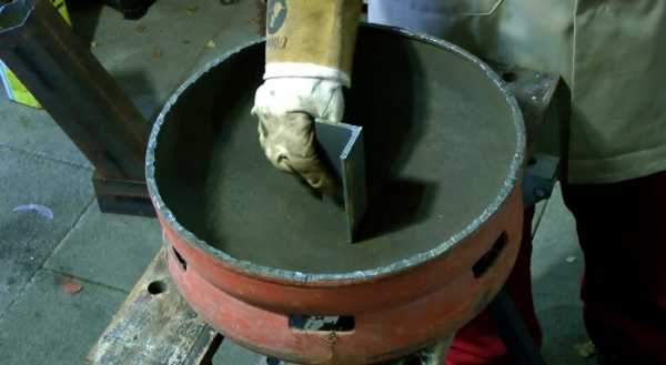 На первом этапе нужно создать прочную подставку. Её изготавливают из металла, приваривают ножки, а затем и корпус готовой печки. Маркером на баллоне намечают места поддувала, дымохода и отверстия для топлива. Проёмы вырезают зубилом, шлифовальным аппаратом или резаком. Дрелью сверлят отверстия в нижней части корпуса. Сверху крепят короб-зольник, его делают из крепкого жаропрочного металла. К проёму приваривают заслонку, которая будет выполнять функции поддувала.