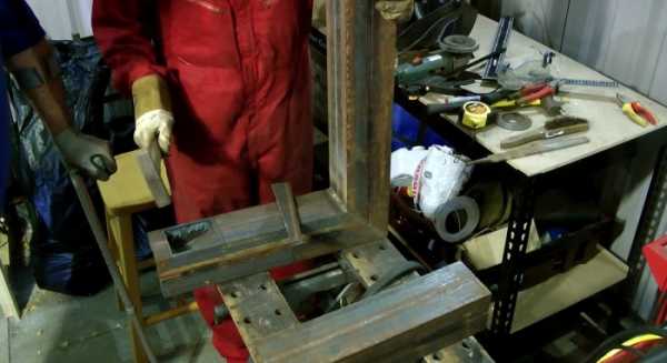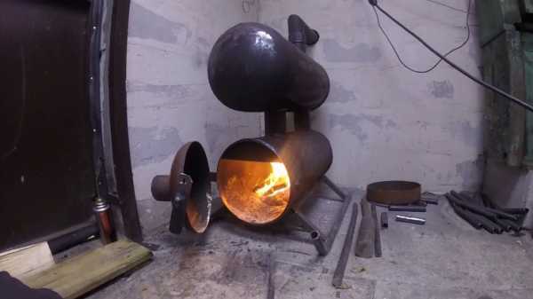 Трубу нужно брать из толстого металла, поскольку нижняя часть дымохода будет контактировать с разогретыми дымными газами. Тонкий металл в этом месте быстро прогорит. Теперь к нижней части печки приваривают прочные ножки из арматуры, кусков металла или отрезков металлического уголка. Они должны выдерживать и вес самой конструкции, и топлива, которое будет в нее загружено.