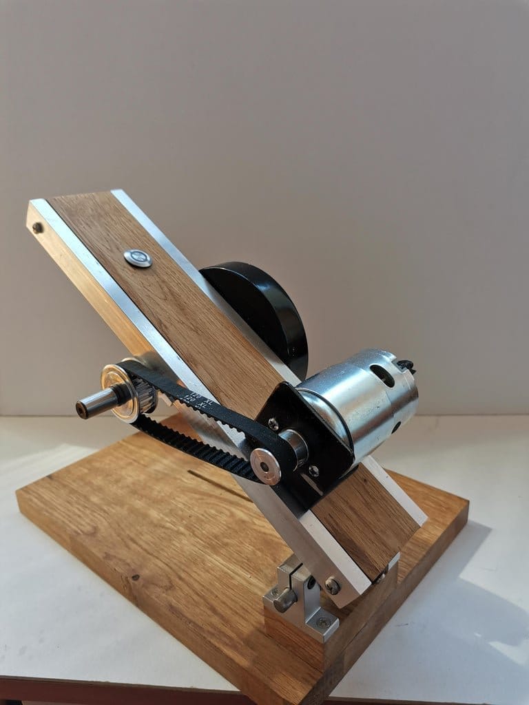 Для работы можно воспользоваться трехфазным электродвигателем, мощностью 2 200 Вт. В качестве опоры монтируется качающаяся плита, которую держат шарнирные соединения. Ремень шкива электродвигателя натягивается за счет откидного устройства. Маятник делается из материала, который был использован для каркаса.