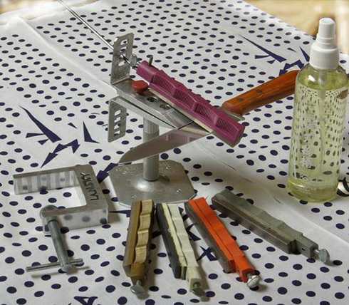 Имеется колоссальное количество приспособлений, позволяющих заточить РК ножа под одним определенным углом, да и вообще все заточные приспособы призваны решать эту задачу.