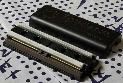 Оригинальную и очень неплохую модель для заточки предложила SPYDERCO: Spyderco Tri-Angle sharpmaker. Треугольные бруски разной зернистности (коричневый — более крупный, белый — для доводки) вставляются в основу под углом 15° или 20° (общий угол заточки будет соответственно 30° и 40°) и вам остается провести режущей кромкой по брускам, следя чтобы нож всегда находился в вертикальной плоскости, угол заточки (30° или 40°) получается автоматически (аналогично работе с мусатом). Проведя заточку на коричневом бруске, переходим на белый. Очень удобное и практичное изделие c одним недостатком — возможно задать всего два угла. С другой стороны, углы выбраны достаточно грамотно и удовлетворяют большинство пользователей.