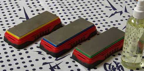 Искусственный абразив состоит из зерен абразивных материалов, помещенных в связующее вещество (бруски, круги, шлифовальная шкурка или лента, пасты и так далее). Наиболее часто встречаются алмазные и керамические. Алмазный абразив снимает металл наиболее интенсивно, но он сильно чувствителен к значительным усилиям и ударам. Его, как и любой другой абразив желательно увлажнять для снижения износа и засорения, а также более «мягкой» работы. Увлажнять можно просто водой, а можно легким специальным маслом (иногда используют даже Johnsons Baby Oil). И воды и масла надо немного — только увлажнить поверхность. Что лучше — вода или масло — вопрос дискуссионный. Масло позволяет производить заточку более комфортно и мягко. После воды легче бруски мыть. В общем, что есть, тем и пользуемся. В течение какого-то времени появятся предпочтения и можно будет выбирать.