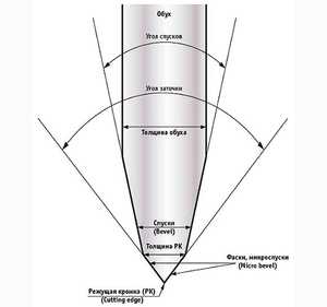 Нож — это всегда сочетание клинка и рукояти. Но клинки могут сильно различаться и имеют составные части. Та часть лезвия, за которой нужно постоянно ухаживать и регулярно затачивать, состоит из следующих деталей: