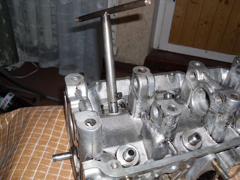- В случае, если используется описанное выше самодельное приспособление для притирки, то его необходимо вставить клапан в его седло, перевернуть головку блока цилиндров, и надеть держатель на стоящий в клапанной втулке и смазанный притирочной пастой клапан. Далее нужно закрутить болт с тем, чтобы закрепить клапан в трубе как можно крепче.