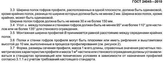 ГОСТ 24045-2010 – более современная редакция ГОСТ 24045-94, которая используется с 2011 года. Однако большинство производителей не спешат переключаться на нее, поскольку, в ГОСТ 24045-2010 на профнастил сортамент и размерные показатели в отличие от старого предшественника не регламентируются. В нем указаны лишь диапазоны углов трапеции для каждой из трех групп профлиста.