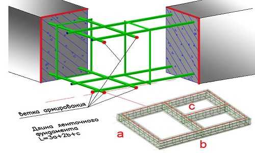 Армирование угла и примыкания ленточного фундамента.