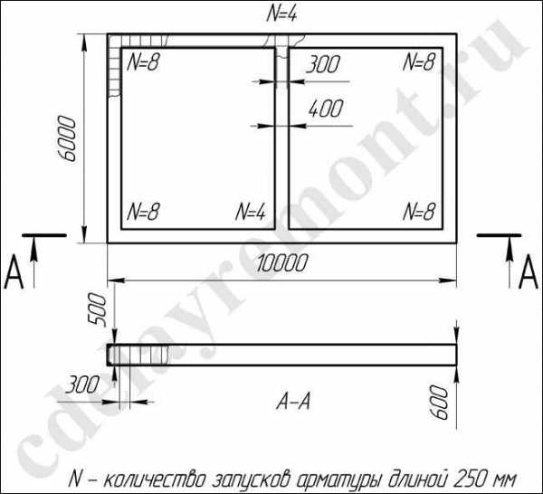 Рассмотрим, как рассчитать арматуру для ленточного основания, на примере здания 10х6 м с одной внутренней несущей стеной, глубина закладки 0,6 м, ширина — 0,4 м. Исходя из этих данных, получаем: