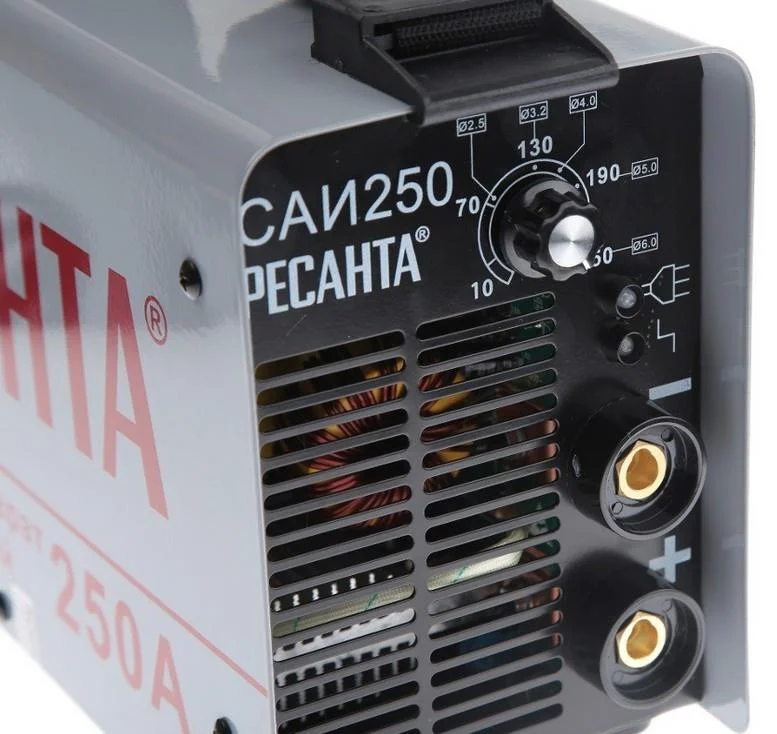 Сварочный аппарат Ресанта 250 выполнен из прочного металлического корпуса с многочисленными вентиляционными отверстиями по бокам. На лицевой поверхности панели расположены разъемы для силовых кабелей, а также многочисленные индикаторы, которые позволяют контролировать параметры сварки.