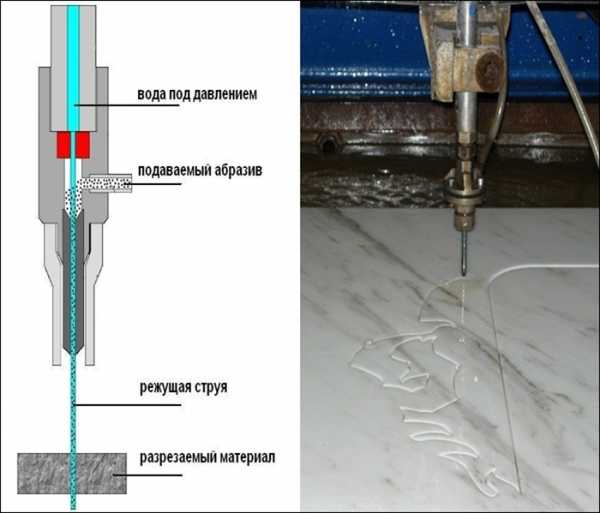 Принцип работы такого станка довольно прост, несмотря на сложность самой конструкции. Через специальное узкое сопло подается поток воды, смешанной с мельчайшими абразивными частицами под огромным давлением. Именно эта вода и режет даже самые прочные, твердые и вязкие материалы, вплоть до металлов. Потому разрезать керамогранит на таком станке будет очень легко.