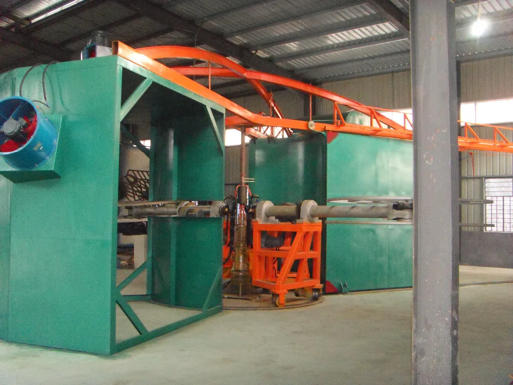 Ротационная формовочная машина имеет три этапа: загрузку и разгрузку, газовые печи с высокой температурой и станцию охлаждения. Как только открытая форма загружена и закрыта, рычаг машины перемещается в газовую печь. Рукоятка шарнирно вращает форму, используя центробежную силу, чтобы расплавить и равномерно распределить смолу по форме и в углах. Форма будет вращаться от 90 секунд до пары минут, как указано в рецепте. Затем формы перемещаются в камеру охлаждения и продолжают вращаться, пока они охлаждаются либо воздухом, либо холодной водой. Процесс ротационного формования завершается, когда пресс-форма перемещается обратно на платформу рабочего, открывается, деталь удаляется, а затем пресс-форма снова заполняется, закрывается и запирается болтами, готовая к следующему циклу.