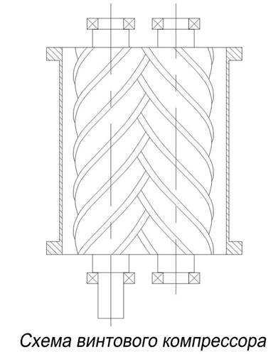Рабочий элемент компрессора – два винтовых ротора, которые вращаются по направлению друг к другу: когда левый ротор поворачивается по часовой стрелке, правый ротор вращается против часовой стрелки. Роторы и корпус разделены небольшим зазором. Оба ротора могут крепиться к валу привода, который приводит компрессор в рабочее состояние. В компрессоре есть впускное и выпускное отверстие для рабочей среды. Винтовые компрессоры могут иметь различные материальные исполнения. Термическая обработка роторов обычно не требуется.