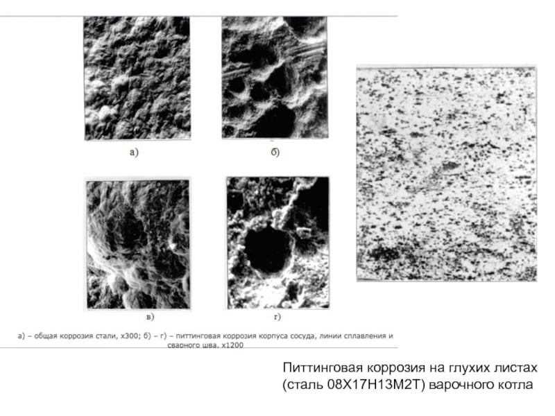 • Питтинговая коррозия — Питтинговая коррозия возникает, когда локальные участки стали теряют свой защитный слой. Эта область становится анодной, а часть оставшегося металла становится катодной, вызывая локальную гальваническую реакцию.