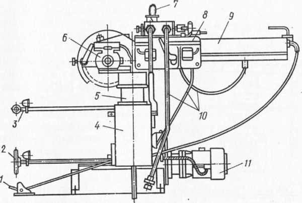 Рис. 1. Торцовочный станок ЦПА-40: 1 — педаль включения гидропривода; 2— маховичок подъема пилы; 3 — стойка; 4— тяга для крепления стола; 5 — колонка; 6 — пила с электродвигателем; 7— манометр; 8—направляющая обойма; 9— суппорт пилы; 10 — гидропривод; 11 — электродвигатель гидронасоса