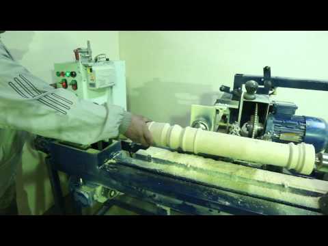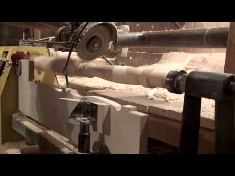 Holzpolierter Baluster auf einer Drehbank в Нахауфнаме. Möbelherstellung, Herstellungsprozess von Treppenbalustern