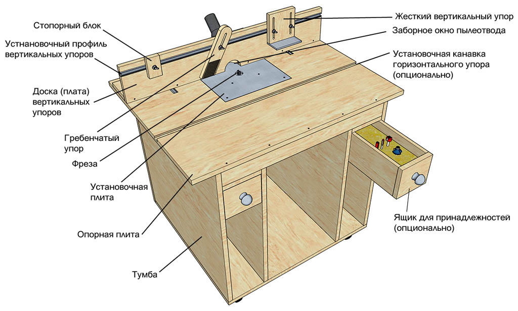 Убедитесь, что лицевая сторона упора и основание имеют между собой точный угол в 90 градусов. Планка-вставка на упоре меняется при замене фрезы, вырез в планке учитывает диаметра фрезы после замены. Дополнительные накладки могут быть любой длины и ширины. Креплении стола и вспомогательных элементов к верстаку разное. Дополнительные накладки расположены и крепятся с двух сторон столешницы, внизу имеют короткие бруски твердой древесины, для вставки их в тиски на верстаке.
