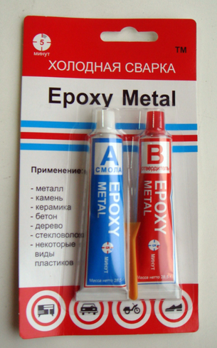 - Жидкую сварку для металла — когда эпоксидная смола и отвердитель находятся в отдельных тюбиках. При необходимости содержимое в нужном количестве используется, а остаток ещё послужит — без потери качества, но с учётом требований к условиям хранения и срока годности. Повышает прочность соединения использование армирующей сетки.