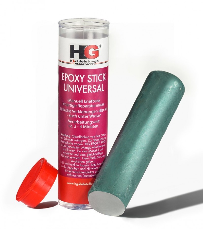 - Пластичную или сухую сварку для металла — когда в фирменной упаковке находится стержень из двух слоёв разного цвета. Отрезается нужное количество, и полученный «пенёк» разминается в руках подобно пластилину, а после этого наносится на подготовленную поверхность. Остаток стержня необходимо предохранить от контакта с воздухом и теплом, в противном случае он утратит ценные качества.