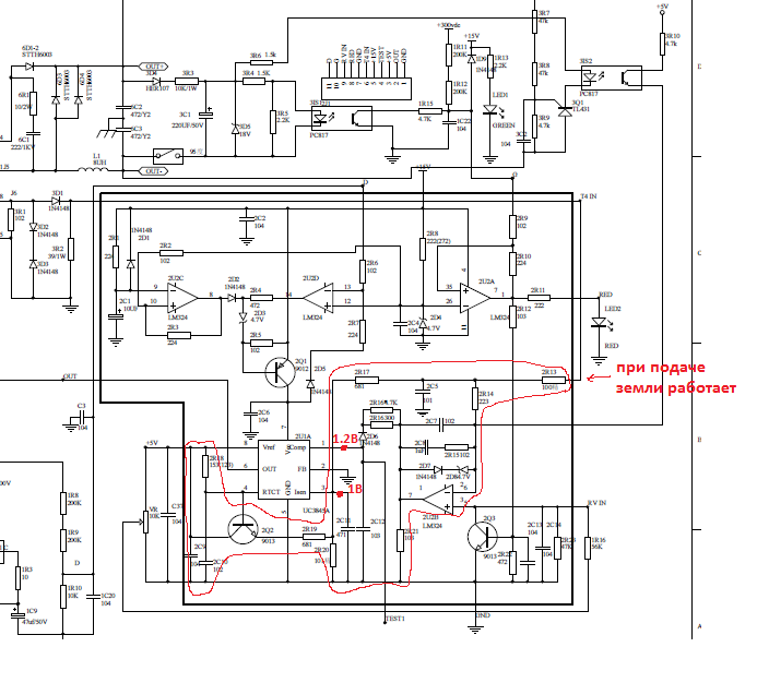 7. Замыкаю выход оптрона 3IS1 (обведён красным) для отключения защиты от залипания и проверяю расширение импульса до номинального значения, частота при этом не меняется.