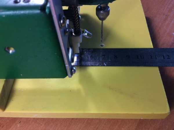 На фото видно, что расстояние от упора в основание сверлильного станочка до оси сверла составляет 68мм, что и обеспечивает ширину обрабатываемых печатных плат не менее 130мм.
