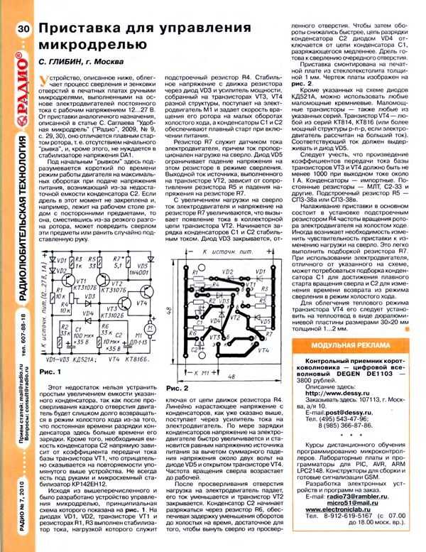 Для удобства пользования сверлильным станочком было собрано и испытано два варианта регуляторов частоты вращения двигателя. В первоначальном варианте сверлилки с электродвигателем ДП25-1,6-3-27 регулятор был собран по схеме из журнала Радио №7 за 2010 год: