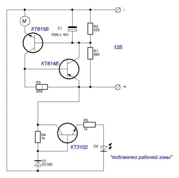 На плате управления кроме собственно регулятора оборотов двигателя расположен еще и простейший стабилизатор напряжения питания светодиода подсветки рабочей зоны. Полная схема платы управления: