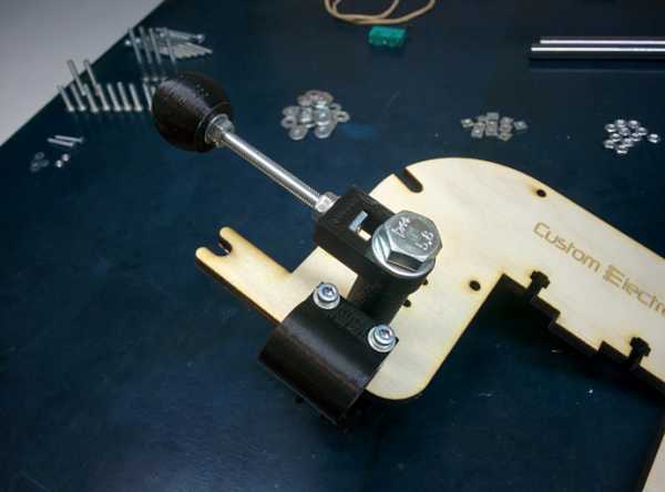 Далее устанавливается ручка с шестерней. Вал вставляется в большое отверстие, на него устанавливается основание ручки и все это стягивается болтом на 8мм. Самой ручкой служит винт на М4:
