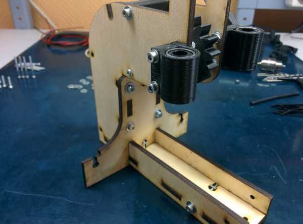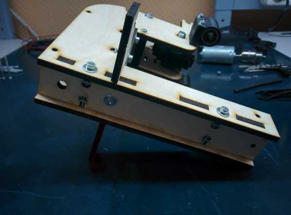 Пока все отлично, все идет по плану. Затем нужно закрепить данный механизм вертикально на подставке. В данном случае подставка будет из дерева. Для этого вырезаем 2 треугольника и с помощью саморезов все закрепляем.
