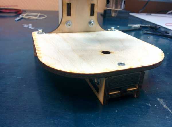В столике на переднем отверстии необходимо сделать зенковку, чтобы винт с головой впотай не мешал сверлить плату. С торца также установлена напечатанная крепежная деталь.