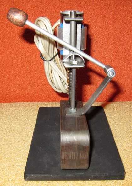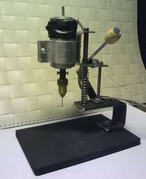 Управление вертикальным перемещением сверлильной головки осуществляется при помощи специальной ручки, один конец которой соединяют с корпусом сверлильного мини-станка, его амортизатором или стабилизирующей рамкой.