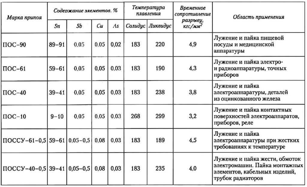 Мягкие применяют для лужения и пайки швов посуды, электроаппаратуры, печатных плат, трубок теплообменников. Самые распространенные из них это оловянно-свинцовые (см. табл.1).