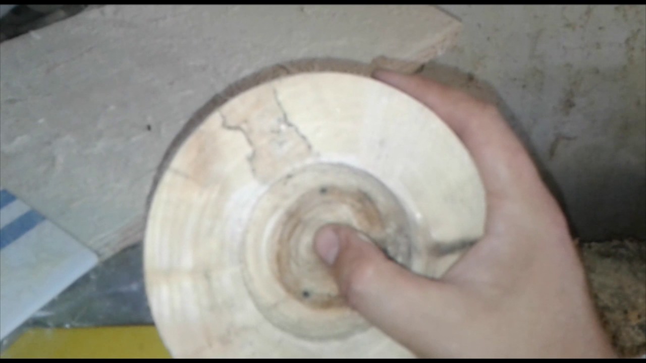 На этом этапе я использую обычные металлические отрезные фрезы для обработки фанерного диска. Я приклеил ступицу с обеих сторон диска, чтобы мой 4-х кулачковый патрон мог захватить его с обоих концов, что позволило мне обрабатывать обе стороны. Ступица спереди снимается позже. | |