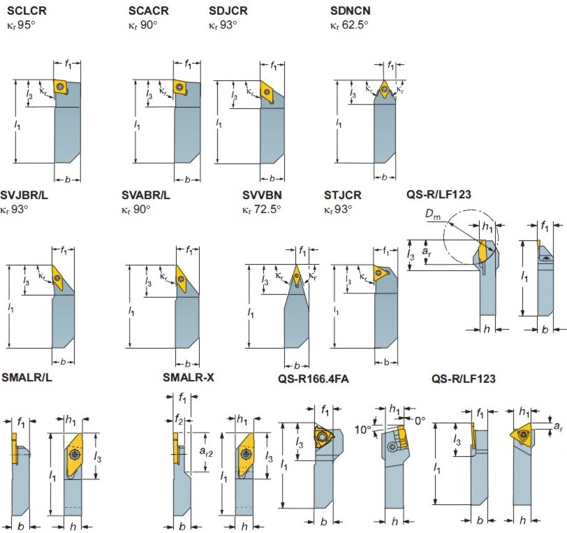 В зависимости от формы державки, в сечении различают прямоугольные и круглые резцы. Прямоугольную в сечении державку имеют резцы для обработки наружных поверхностей (резьба, канавки, цилиндр и так далее). Державка округлой формы характерна для резцов, которыми обрабатываются внутренние поверхности (внутренняя резьба, внутренние канавки под стопорные кольца подшипников, отверстия и так далее). Такие типы резцов (с круглой державкой) устанавливаются в револьверную головку через специальный переходник, который позволяет регулировать угол поворота резца вокруг оси с целью совмещения вершины резца с осью вращения заготовки. Если вершина резца не будет совпадать с осью вращения заготовки, то инструмент будет подвержен повышенному износу из-за неправильного схода стружки и увеличенной нагрузки.