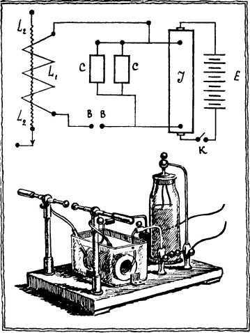 Резонанс-трансформатор Теслы: Е — батарея или другой источник тока. J — индукционная катушка. ВВ — искровой разрядник. СС — батарея лейденских банок. L1 — первичная катушка трансформатора. L2 — вторичная катушка трансформатора. К — механический прерыватель. На нижнем рисунке катушки L1 и L2 погружены в масло.
