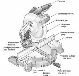 Конструкция инструмента на первый взгляд может показаться вполне обычной – основание, отлитое из металла (чаще всего алюминий), фрезеровальная округлая плоскость с установленной поворотной рамой, обеспечивающей движение пилы в горизонтальной плоскости. С тыла находится поворотный механизм, который обеспечивает подвижность аппарата в вертикальной плоскости. Двигатель, редуктор и пильный диск крепятся в проушину верхней части стойки. Вот и вся конструкция! Конечно же, у каждой модели есть свои нюансы – многие оснащают агрегаты защитным кожухом, который полностью закрывает пильный диск в поднятом состоянии пилы и раскрывается при нажатии на рычаг, очень часто подвижная рама бывает с пружиной, чтобы при отпускании инструмент поднимался самостоятельно вверх.
