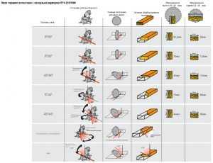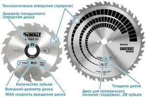Диаметр пильных дисков — это не единственный показатель, по которому отличается между собой оснащение инструмента. Разница существует также в строении пилящих зубцов, способе их заточки и материала изготовления. Все эти показатели влияют на быстроту и качество работы. Одно строение зубцов способствует быстроте и качественному исполнению при срезе поперек, другое — при распиле вдоль. Иное строение зубцов обеспечит аккуратный распил при работе над конкретной породой древесины или применимо для обработки металла или пластика. Вариантов достаточно большое количество.