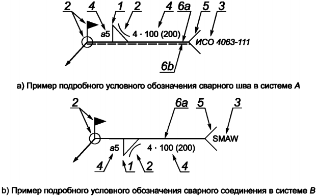 - T: Это часть хвоста для указания информации для конкретного сварного шва, такой как изменение процесса сварки или электрода. Хвост может быть опущен, если нет каких-либо спецификаций или ссылок.