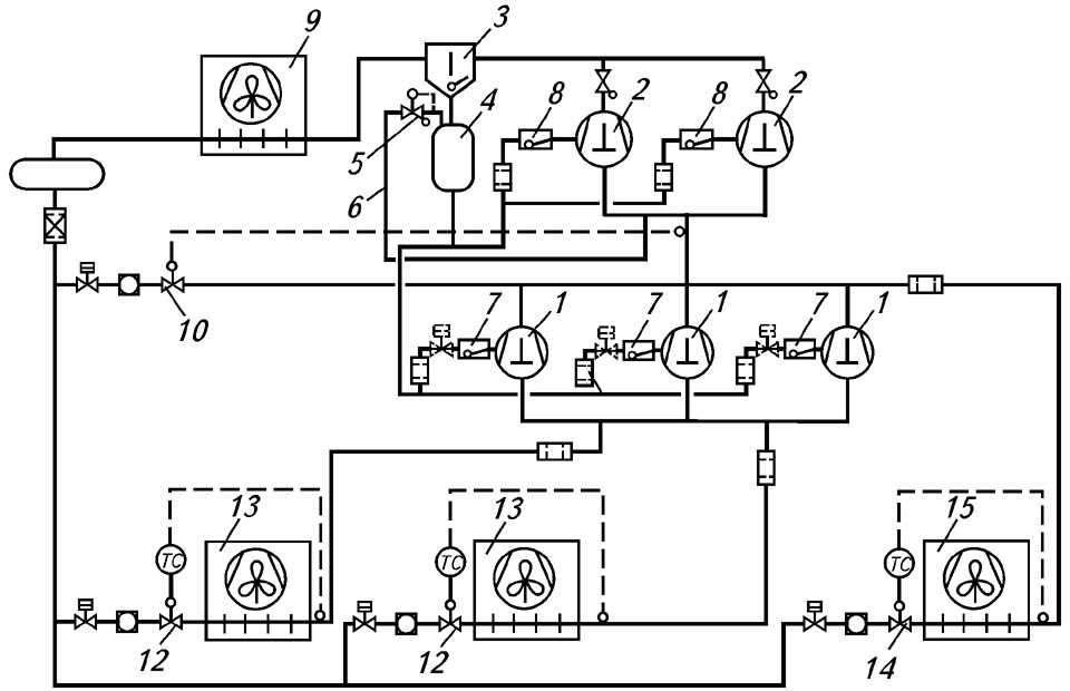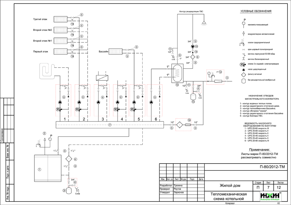 На схеме отражают и другие важные элементы и детали: точки забора воды, насосы, различные клапаны и краны, мембранные баки, направление потока жидкости и т.д. Условные обозначения этих и других элементов представлены на картинках.