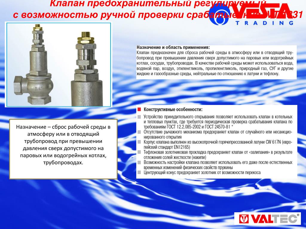 Предохранительные клапаны — специальные устройства, предназначенные для защиты трубопроводной системы от воздействия повышенного давления, способного привести к ее повреждению. Клапан позволяет сбросить излишки рабочей среды в дренажную систему или атмосферу, чтобы вернуть уровень давления в нормальное состояние. После этого клапан закрывается.